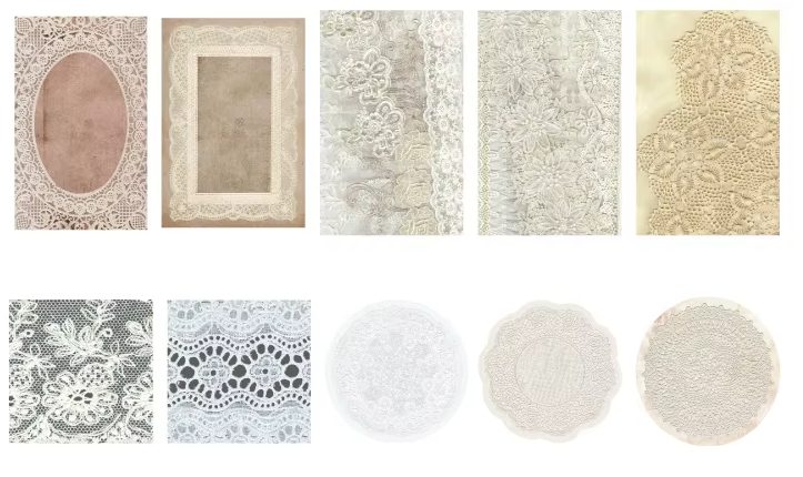 • Styl: vintage, krajkové motivy, jemné textury vhodné pro romantické, nostalgické projekty.