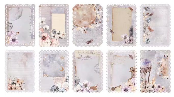 Oživte své papírové projekty elegantním vintage stylem s touto sadou 10 velkých krajkových dekorativních papírů. Každý list je navržen s citem pro detail a přináší rustikální, romantický vzhled, ideální pro diáře, alba, bullet journal, přáníčka i další kreativní výtvory.