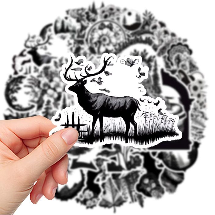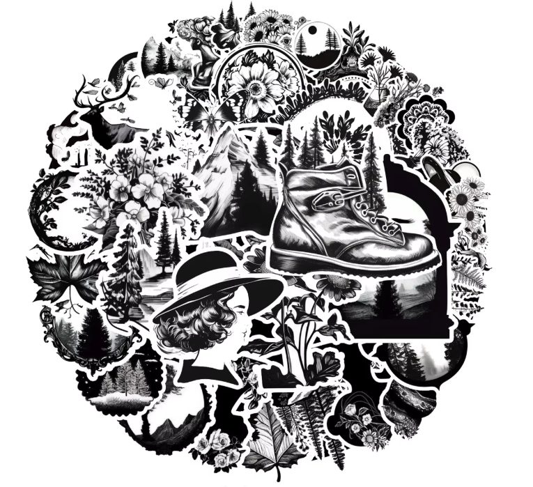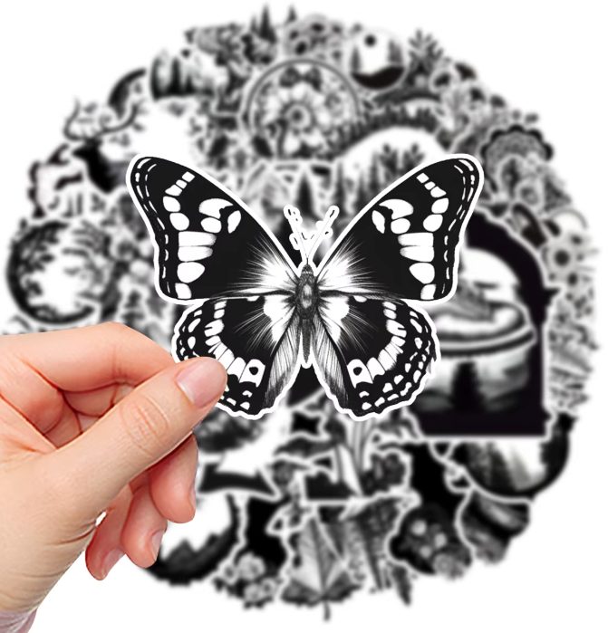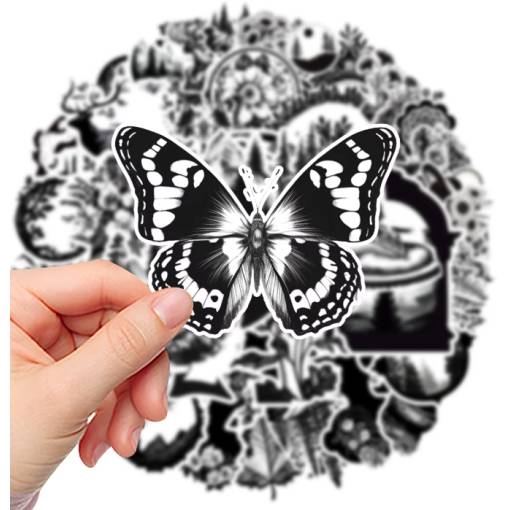 Originální sada 50 černobílých samolepek, které dodají tvým věcem jedinečný vzhled. Samolepky jsou vyrobené z odolného PVC, jsou vodotěsné a snadno se lepí i odlepují bez zanechání stop.