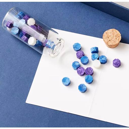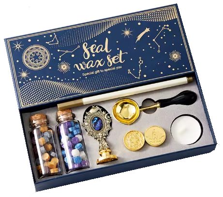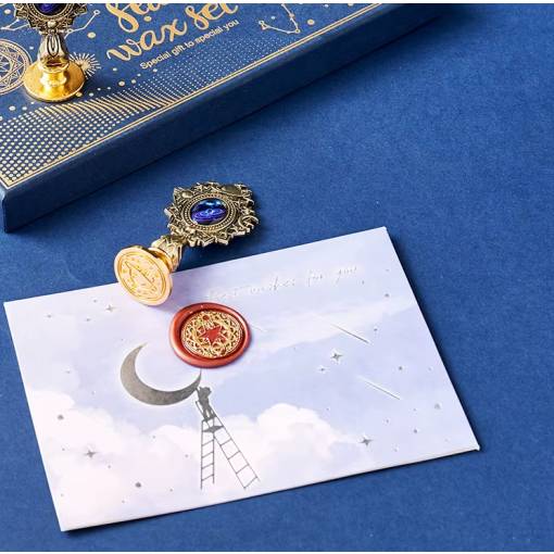 Tato krásná sada na voskovou pečeť v modré krabičce s hvězdným motivem obsahuje vše, co potřebuješ k tvorbě originálních pečetí.