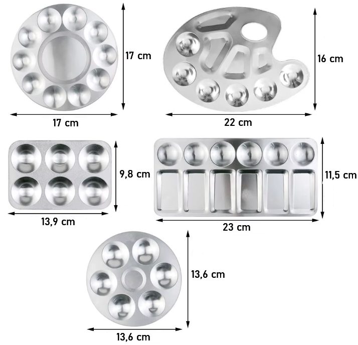 Kovová paleta je ideálním pomocníkem pro všechny malíře a kreativce. Je vyrobena z kvalitního hliníku, díky čemuž je odolná, lehká a snadno se čistí. Hodí se pro akvarel, kvaš, akryl, malování na tělo, nehty nebo jiné kreativní projekty.