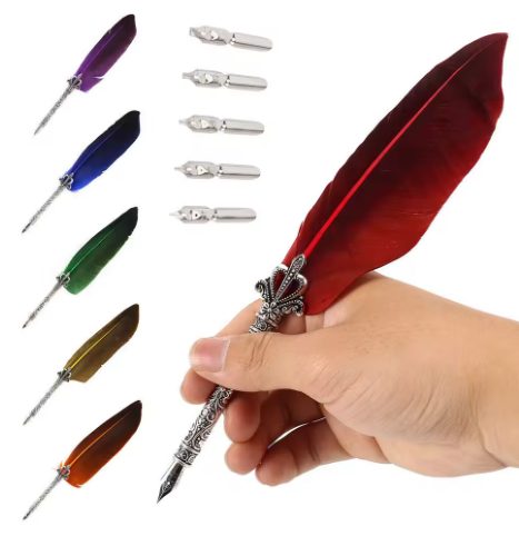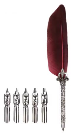 Objevte kouzlo staré Evropy a eleganci ručního psaní s touto luxusní dárkovou sadou. Stylové kaligrafické pero s pravým ptačím brkem kombinuje klasický design s kvalitním kovovým zpracováním, díky čemuž se stává nejen praktickým nástrojem, ale i krásnou ozdobou vašeho psacího stolu.