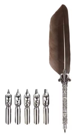 Objevte kouzlo staré Evropy a eleganci ručního psaní s touto luxusní dárkovou sadou. Stylové kaligrafické pero s pravým ptačím brkem kombinuje klasický design s kvalitním kovovým zpracováním, díky čemuž se stává nejen praktickým nástrojem, ale i krásnou ozdobou vašeho psacího stolu.