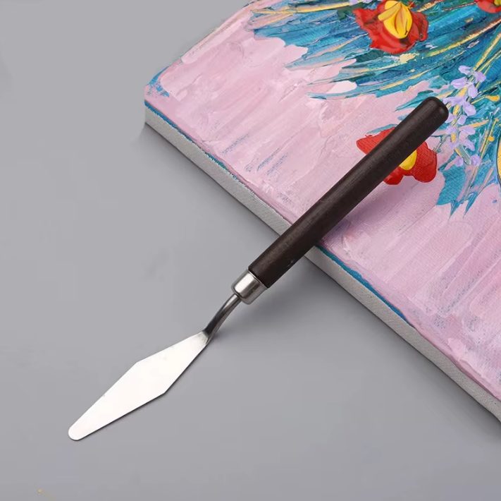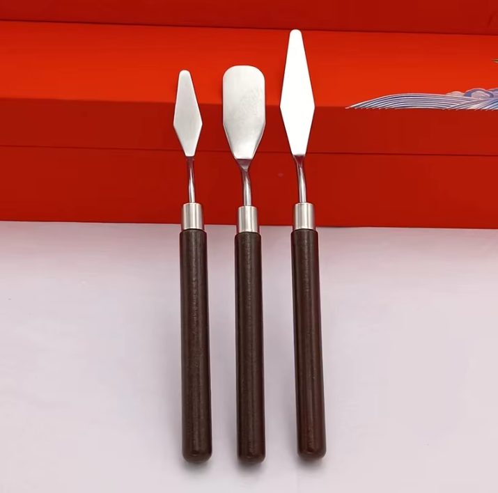 - Škrabka (palette knife) – pro míchání barev na paletě a nanášení texturovaných vrstev.