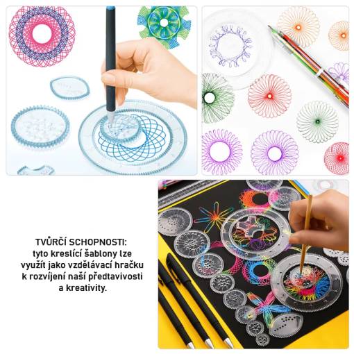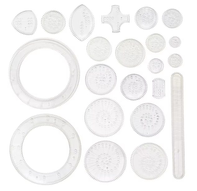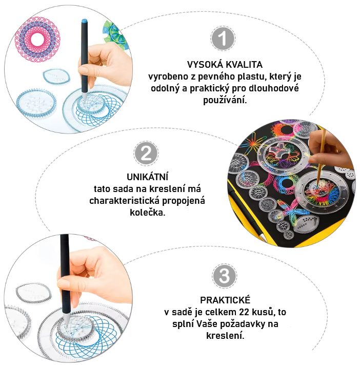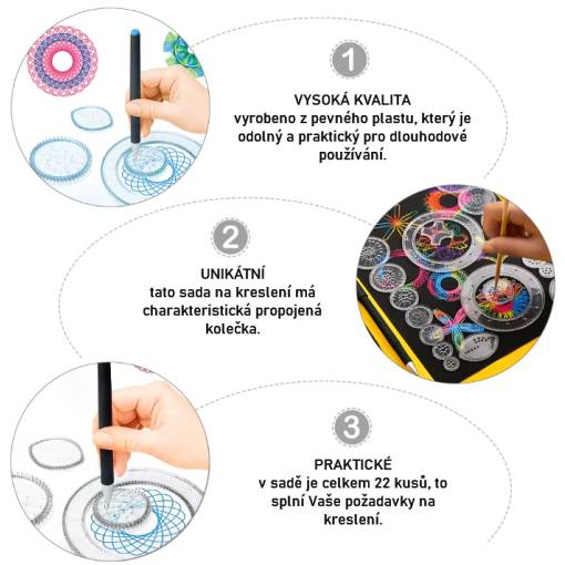 Propojená ozubená kola umožňují vytváření tisíců jedinečných vzorů a tvarů, takže tím můžete rozvíjet svou představivost a jemnou motoriku při každém použití.