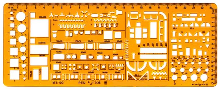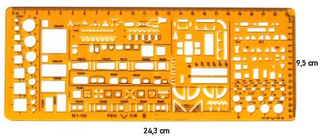 - Kombinuje funkci pravítka a kreslicí šablony.