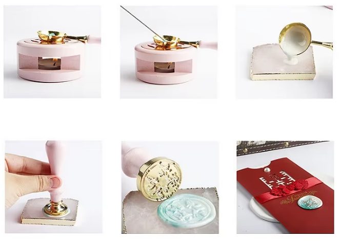 Roztavený vosk lze poté nalít na papír, obálku či jiný povrch a vytvořit tak krásnou pečeť pomocí přiloženého razítka. Perfektní pro scrapbooking, dekorativní řemesla, tvorbu dárků nebo originální oznámení.