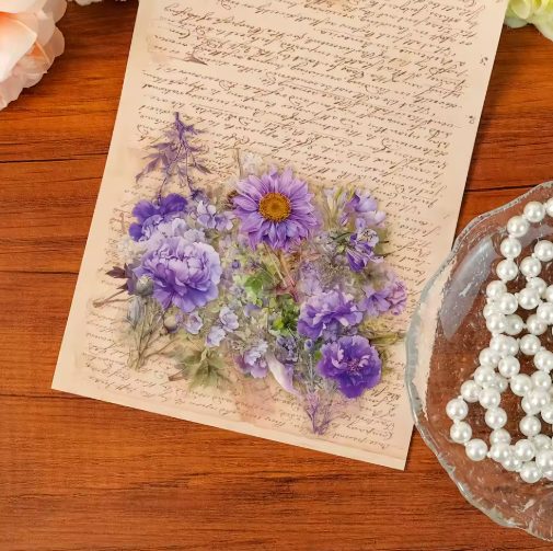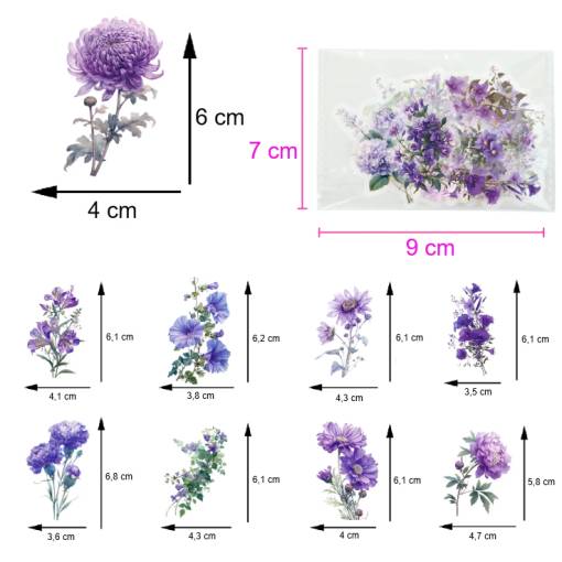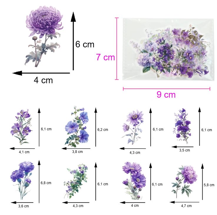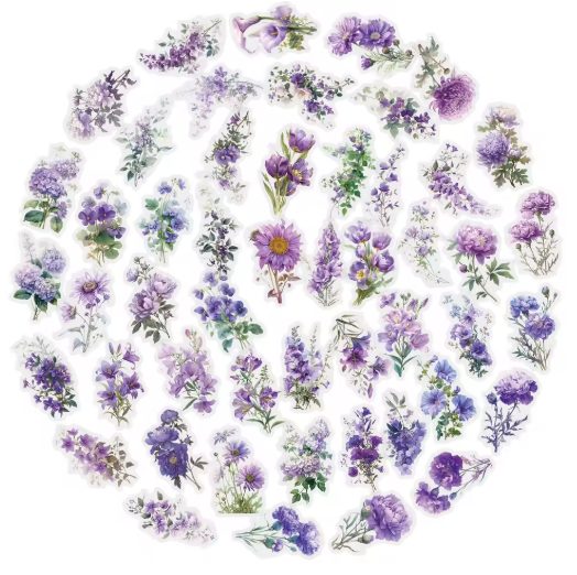 Dodejte svým kreativním projektům jemnost a romantickou atmosféru s touto sadou 50 průhledných květinových samolepek v odstínech fialové.