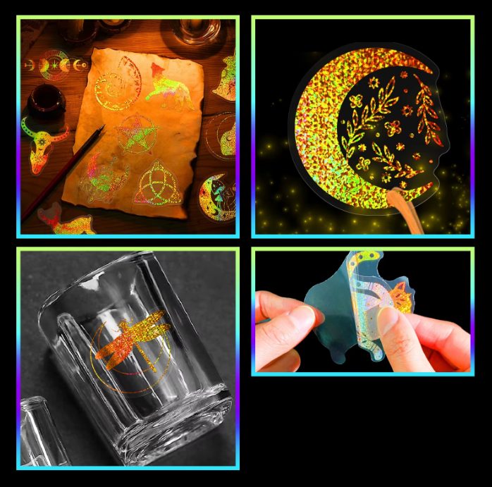 Každá samolepka je lesklá a odráží světlo, čímž vytváří jedinečný třpytivý efekt, který zaujme na první pohled.