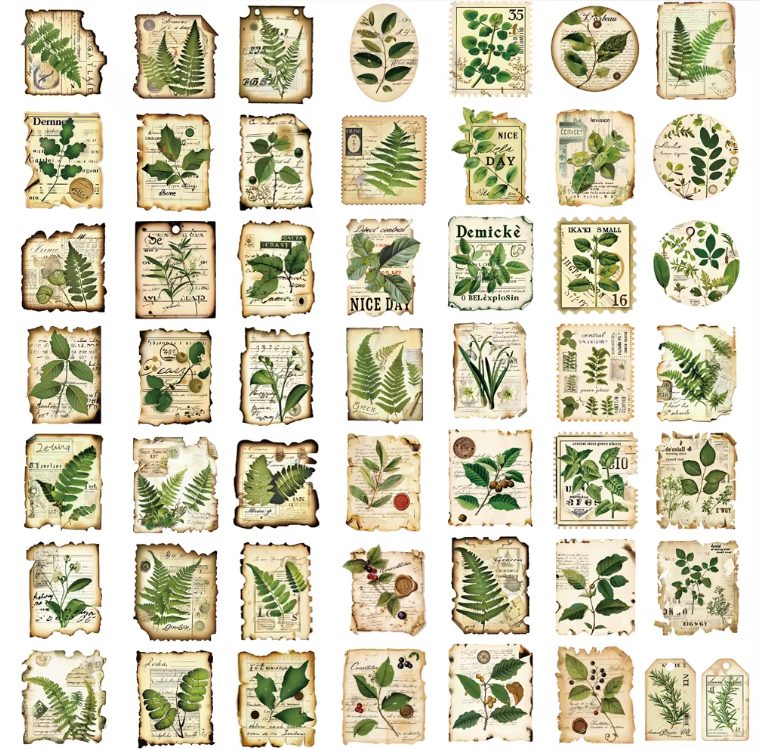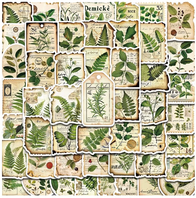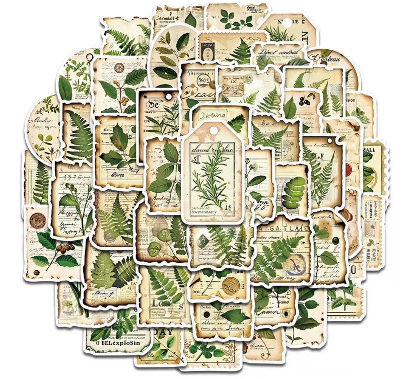 Ozdobte své scrapbookingové projekty, zápisníky, telefony, skateboardy nebo kávové lahve touto sadou 50 stylových samolepek s motivy lesních rostlin.